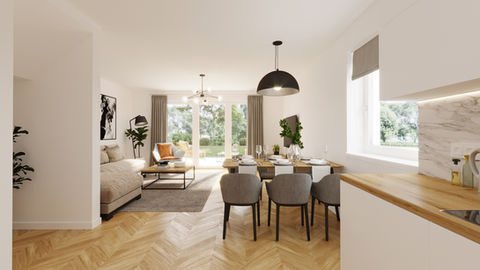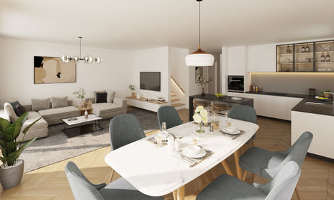 Diese Fläche wird dank intelligentem Grundriss optimal und effektiv genutzt. Im Erdgeschoss befindet sich der offene Küchen-Wohn- und Essbereich mit Zugang zur Terrasse.